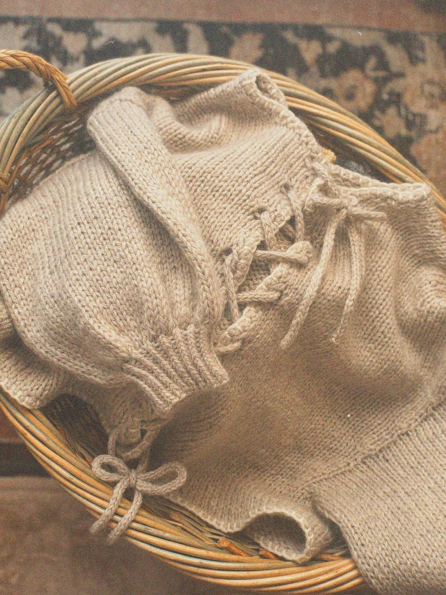 The hem and neckline are finished with a 2-stitch I-Cord Bind Off, followed by a decorative blanket stitch. Finally, two separate I-Cords are knitted and threaded through the back to complete the sweater.