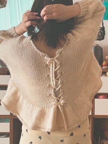 Finally, two separate I-Cords are knitted and threaded through the back to complete the sweater.